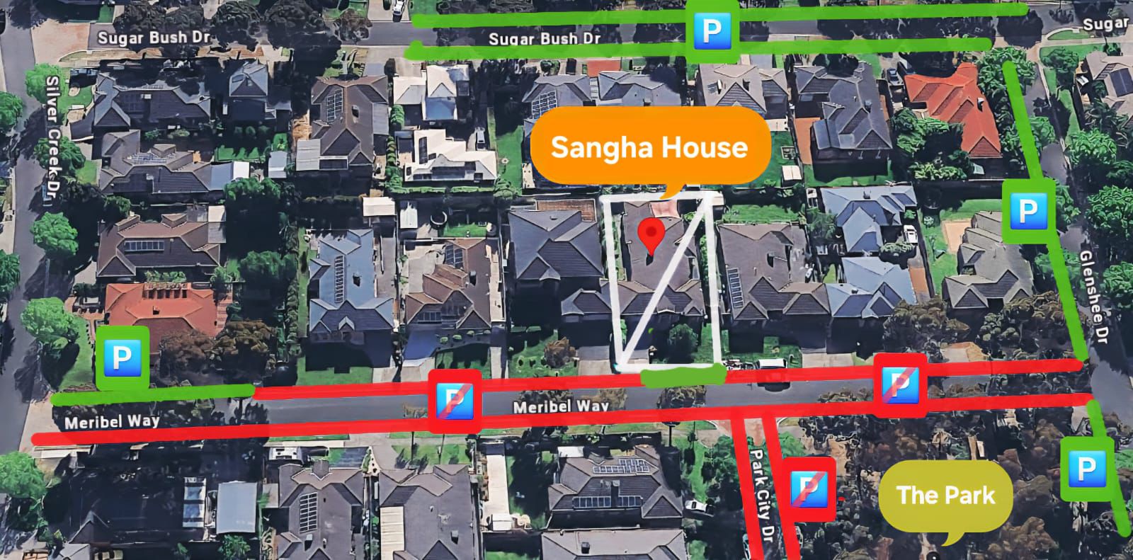 Devotees who come to offer Lunch Dana or attend Dhamma programs are kindly requested to avoid parking vehicles on Meribel Way and Park City Drive.